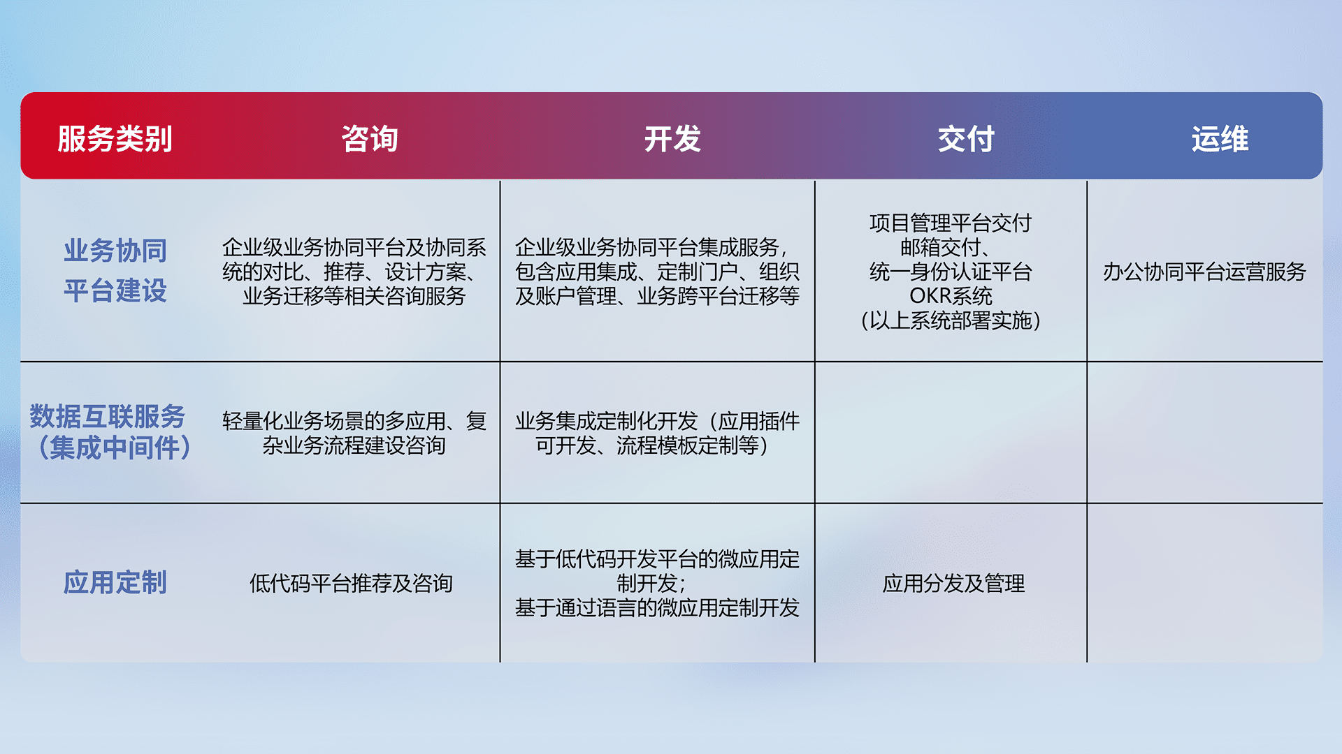 针对钉钉、、、、企微、、、、IDaas等平台级产品提供产品的规划、、、、方案、、交付、、、定制化开发等服务,,实现如统一协同办公、、智能客户服务、、混合会议管理、、、智能数据查询、、、等业务场景,,,实现数字化转型。。。