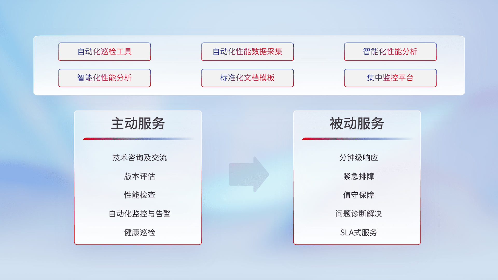 智能化工具和标准化文档,,保障服务质量,,提供主动服务(包含技术咨询、、版本评估、、、性能检查、、自动化监控与告警、、、、健康巡检)和被动服务包含(分钟级响应、、、、紧急排障、、、、值守保障、、、、问题诊断解决、、、SLA服务)。。。。